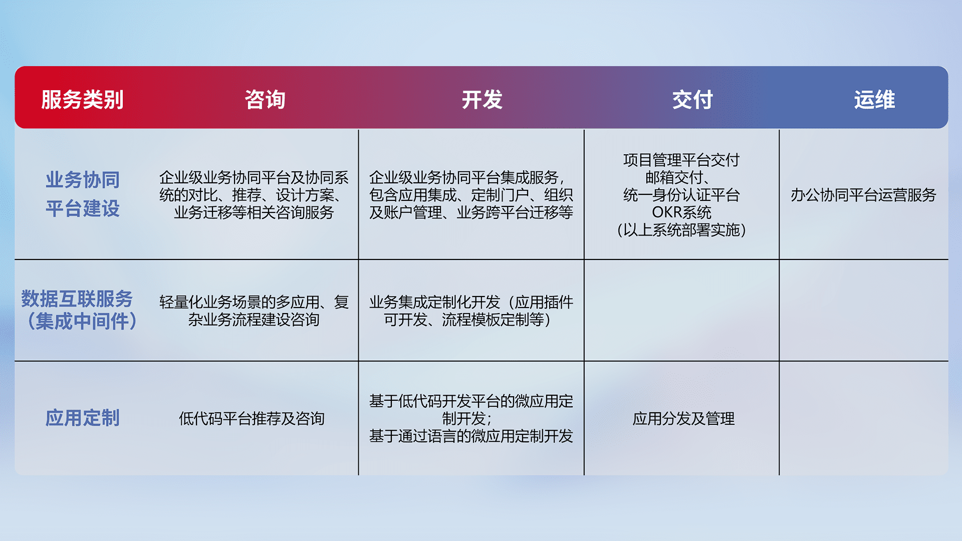 针对钉钉、、、企微、、IDaas等平台级产品提供产品的规划、、、方案、、、、交付、、定制化开发等服务,,,实现如统一协同办公、、、、智能客户服务、、、、混合会议管理、、智能数据查询、、、、等业务场景,,,实现数字化转型。。。。