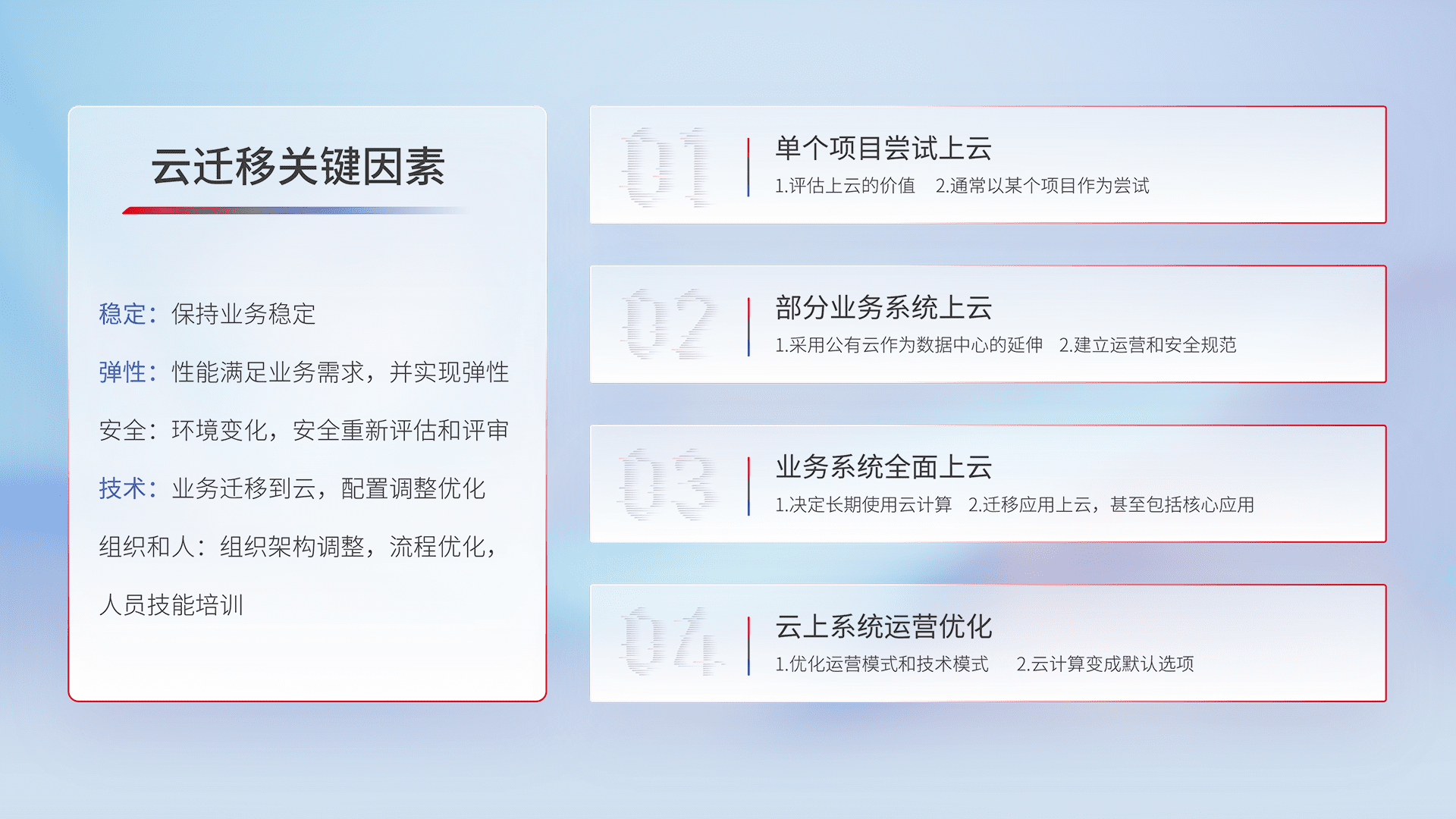 结合实际业务,,从规划设计、、、云平台选型、、云原生改造、、、数据迁移、、、、集成交付,,,迁移全过程为客户识别最佳上云路径,,,,做好风险识别管理,,,设计网络架构、、、、身份权限、、安全审计合规、、、操作审计、、、、日志审计、、、监控告警策略、、、、多站点容灾设计等,,对云上基础设施进行整体规划,,,,提升IT治理水平,,,以满足弹性、、高可用、、高性能的需求。。。