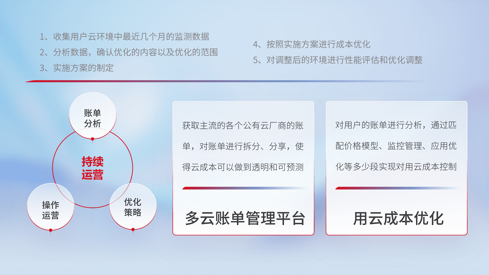 通过多云纳管,,,以统一的资源数据模型把客户的云资源进行抽象和封装,,,进而实现对多云资源的统一操作,,保障云资源管理的可靠性、、稳定性与可用性。。。。量身定制化运维内容,,,配置、、、、开发运维、、、、补丁管理、、、备份、、监控、、认证和访问管理、、审计和日常巡检等,,,,保障在用云过程中的可靠度,,稳定度以及高可用率。。。。