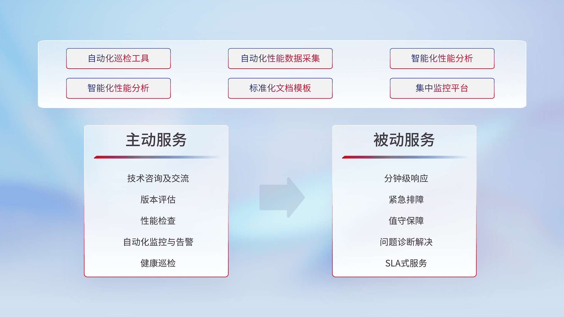 智能化工具和标准化文档,,保障服务质量,,提供主动服务(包含技术咨询、、、版本评估、、性能检查、、自动化监控与告警、、健康巡检)和被动服务包含(分钟级响应、、、紧急排障、、值守保障、、、、问题诊断解决、、、、SLA服务)。。。